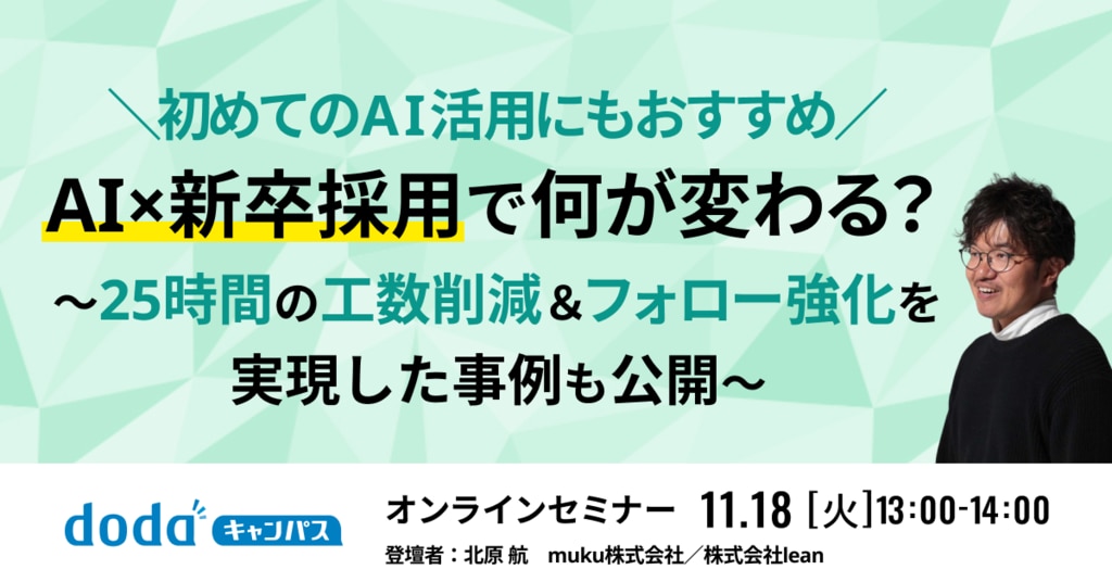 本セミナーでは、100社以上で採用コンサルティング実績を持つ北原氏(muku株式会社/株式会社lean)から、AIを活用して採用業務の工数を25時間削減し、学生フォローを強化した事例をもとに、導入のポイントや実践的な活用方法を具体的に解説いただきます。