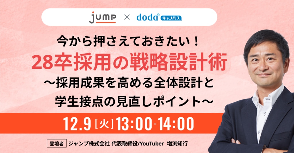 本セミナーでは、数多くの企業支援を行ってきたジャンプ株式会社代表取締役でYouTuberの増渕氏をお迎えし、28卒採用に必要な“全体戦略のつくり方”と“学生接点ごとの見直しポイント”を具体的な事例とともに解説いただきます。