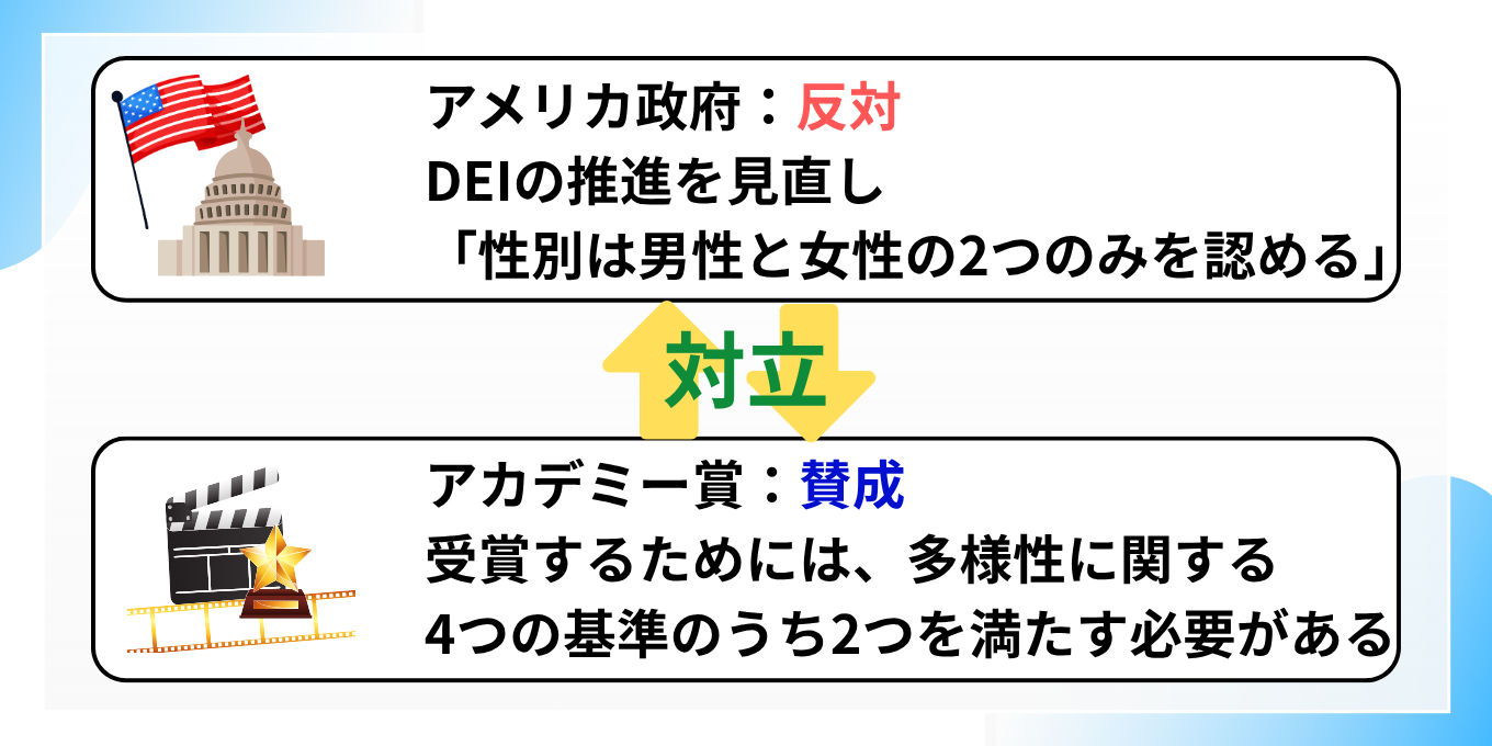 アカデミー賞では多様性を求める新ルールが導入された一方で、州レベルではトランスジェンダーのトイレ利用制限や性的多様性教育の禁止が進み、賛否の分断は深まる一方です。