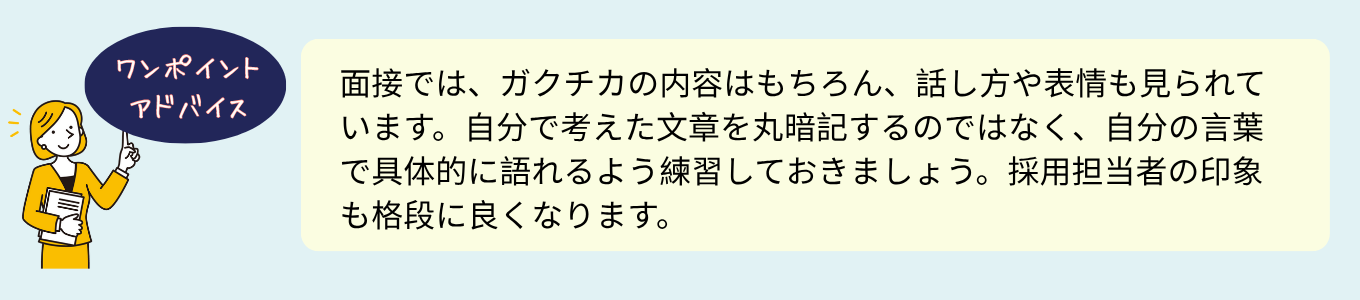 A:面接では「なぜそうしたのか?」「具体的に何をしたのか?」など、深掘り質問が行われます。数字や成果を大きく盛ると、深掘りされた時に矛盾が出てしまい、企業からの信用も失ってしまうでしょう。ガクチカで誇張や虚偽の話をするのは控え、「あなたの本当の良さ」を伝えられるよう、話を組み立てるのがポイントです。