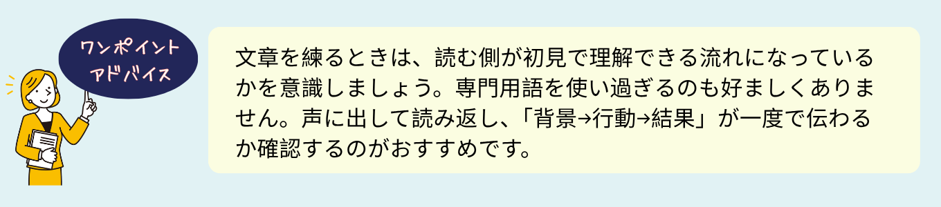 企業は、自ら課題を見つけ、主体性をもって動ける人材を求めています。改善のためには、「自分が気づいたこと」「自分から提案したこと」を必ず盛り込み、能動的な姿勢を示しましょう。