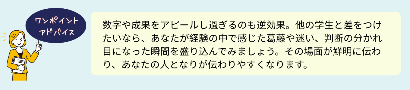 単なる出来事の紹介ではなく、目的→課題→行動→結果→学びの流れで、あなたの価値観や行動特性を伝えることが大切です。大きな成果がなくても、目標に向き合い工夫・継続した経験なら十分に評価されます。