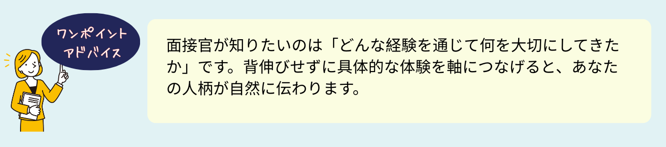 自分の強みや価値観を具現化し、応募先企業の理念や方向性と結びつけて伝えることが大切です。