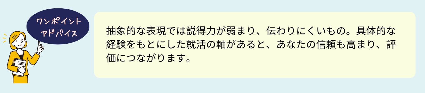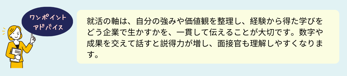 A:自己中心的すぎる軸や、企業ニーズと大きく乖離 した軸は不利です。面接やESでは、「自分の強みを生かして貢献できること」を中心に語るようにしましょう。