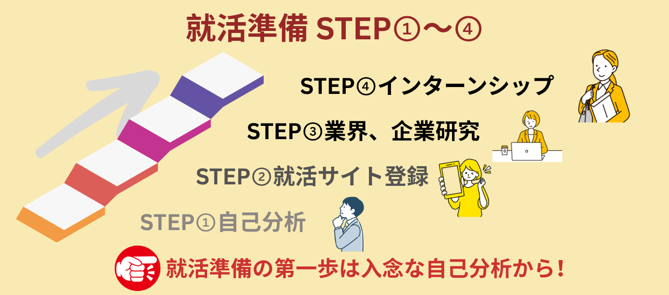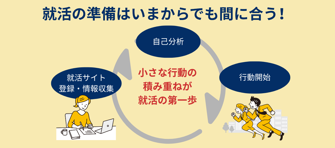 就活はやることが多いように見えますが、まずは「①自己分析」「②就活サイトへの登録」「③情報収集」の3つから始めましょう。