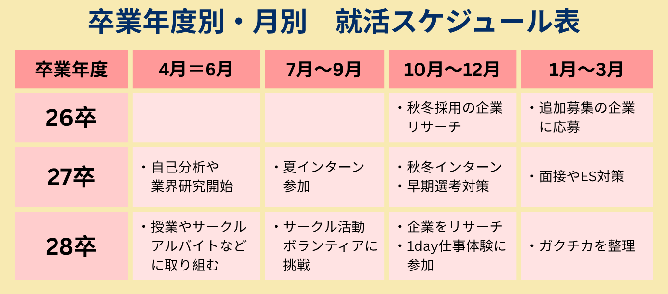 26卒・27卒・28卒それぞれがやるべきことを、具体的に整理します。