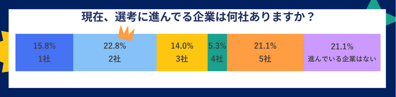 5社も選考に進んでいる方が21.1%と多く、スケジュール管理にも気を遣う必要がありますね。