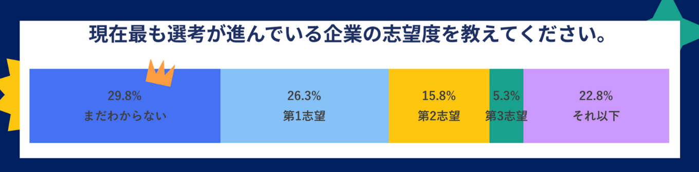 選考中の企業の志望度は、「第1志望」の方も26.3%いますが、「まだわからない」方が最も多く29.8%でした。