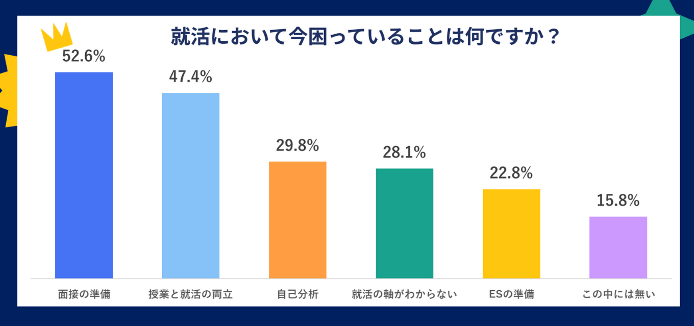 「選考が面接まで進んでいる」「複数社の選考を並行している」方が多かったことから、困りごとのTOP2は『面接の準備』と『授業と就活の両立』でした。
