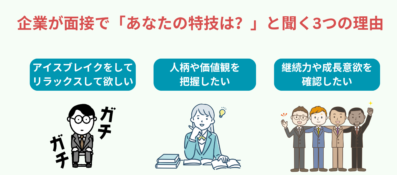 特技を通じて、あなたの人柄や価値観を理解し、「企業や職種への適性を見たい」という目的もあります。
