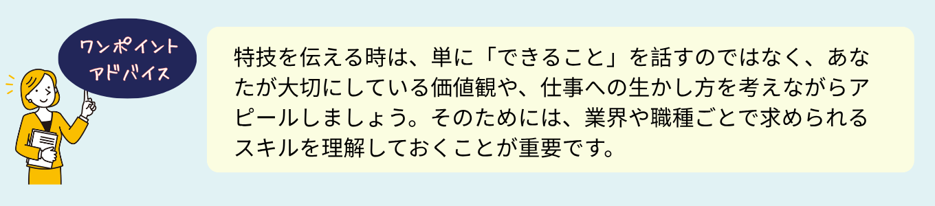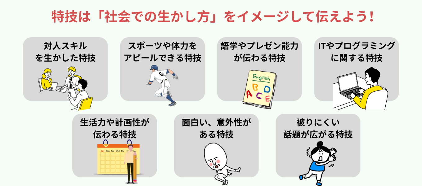 これらの特技を伝える際は、単に高度なスキルを述べるだけではなく、他者と差別化できる点や活用シーンを具体的に示すと良いでしょう。
