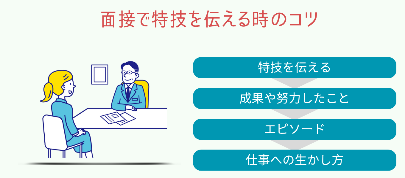 特技をアピールする際は、努力の背景や具体的なエピソードまでを伝えることが大切です。「特技 → 努力したこと → 成果やエピソード → 仕事への活かし方」という流れで話しましょう。