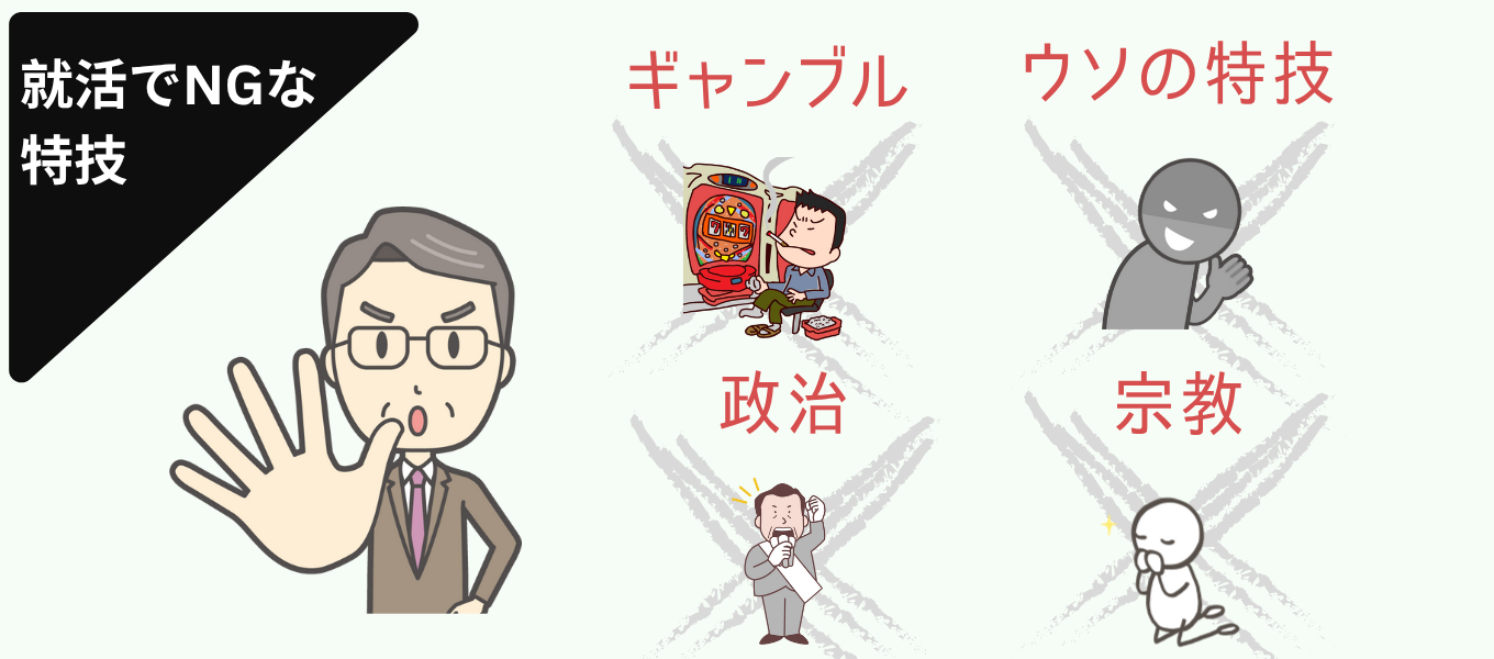 就活で伝える特技の内容によっては、採用担当者の印象を損ねてしまう場合があります。自分では面白いと思っていても、企業にとって不適切な特技や、社会人としての常識を疑われるような特技は避けましょう。