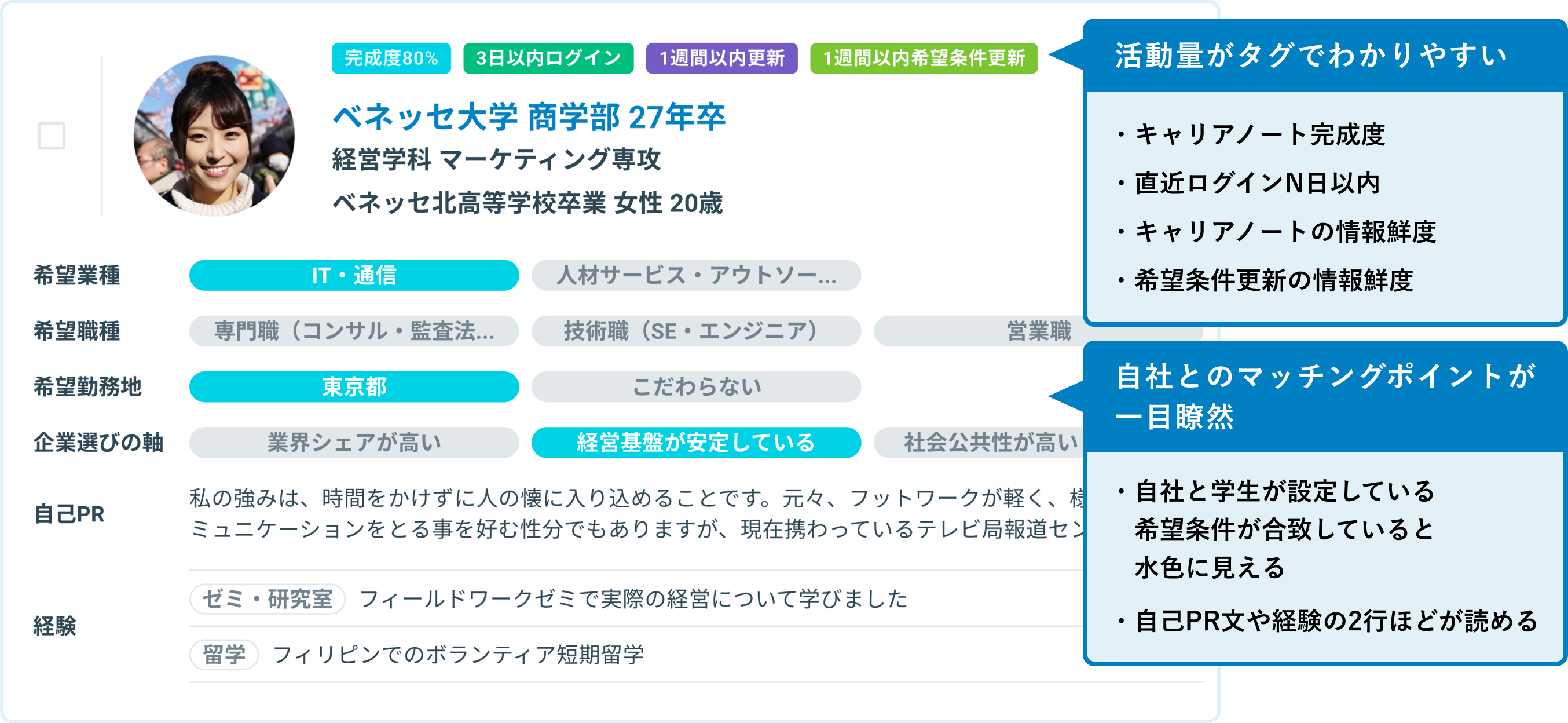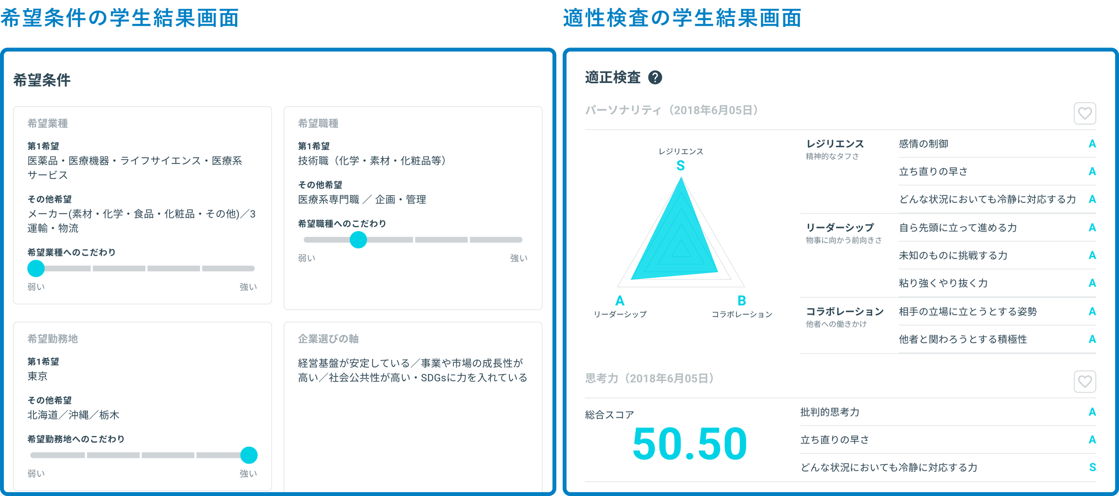 企業選びの軸や適性検査の結果など、採用時に必要な情報が可視化されています。大学や独自プログラムと連携した項目設計により、高い入力率を実現しています。