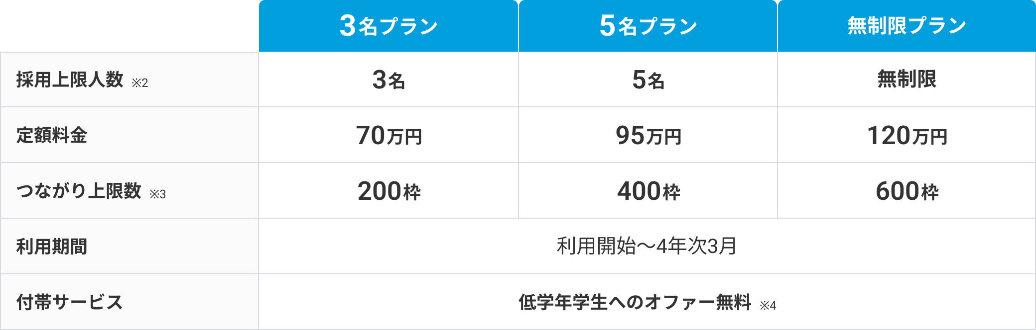 ※1:採用上限人数 料金内で採用することができる上限人数です。上限人数を越えて採用すると一人当たり35万円(税別)の成功報酬料金がかかります。