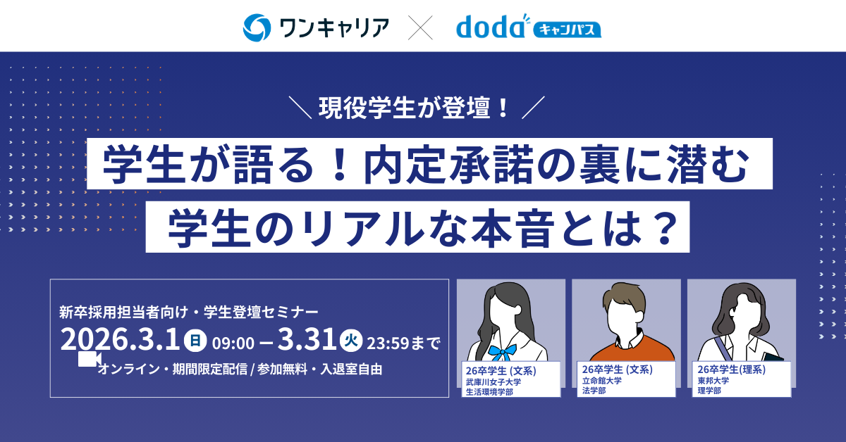 学生自身の体験を通じて、内定承諾前後にどのような心理変化が起きているのかを紐解きます。さらに、辞退を防ぐためのサインや、学生が安心できるフォローアップの方法についても解説いたします。